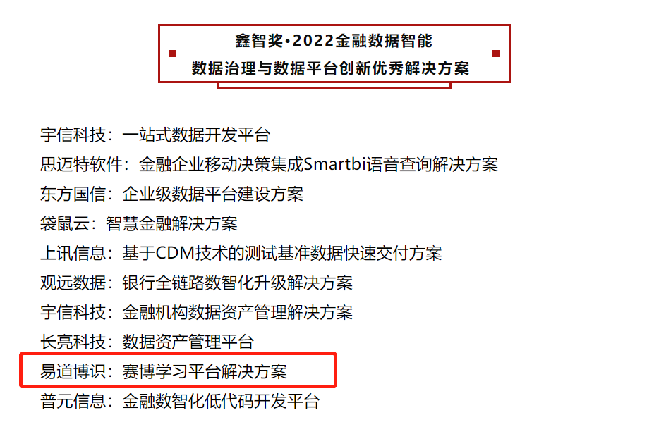 鑫,多金,數據即未來的財富;智,代表智能。由金科創新社主辦、全球金融專業人士協會支持的“鑫智獎·第四屆金融數據智能優秀解決方案評選”圓滿結束,易道博識的賽博學習平臺解決方案入選“數據治理與數據平臺創新優秀解決方案”。