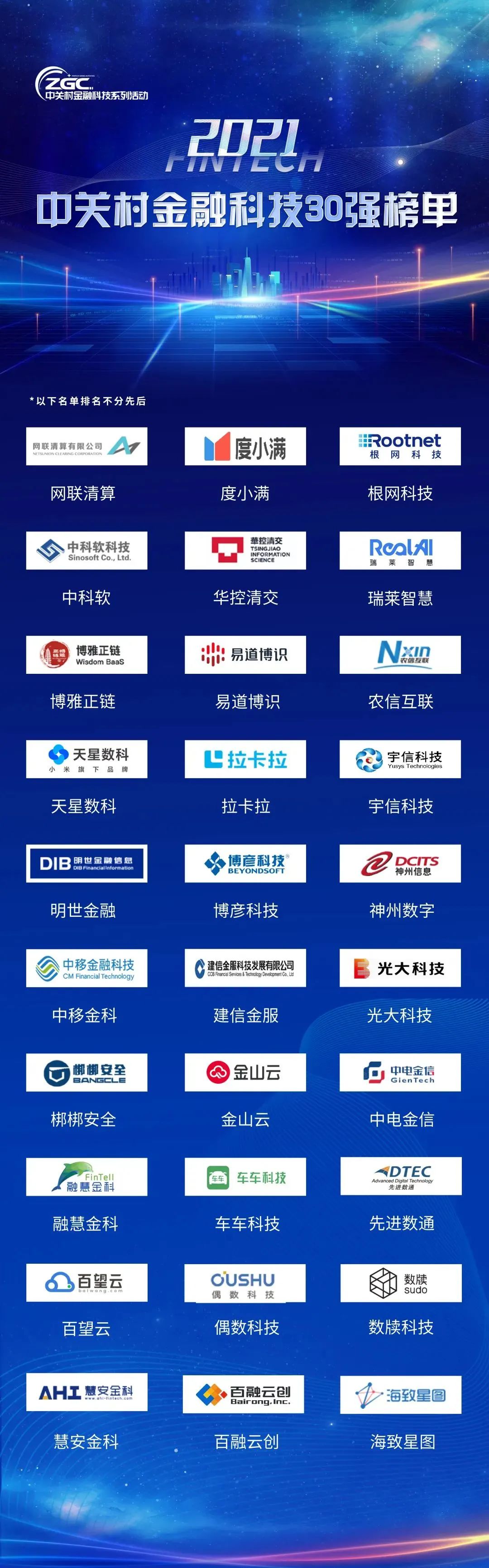 最終上榜的企業(yè),均是中國金融科技各領域內(nèi)競爭力強、資本市場認可度高、具有代表性的企業(yè)。