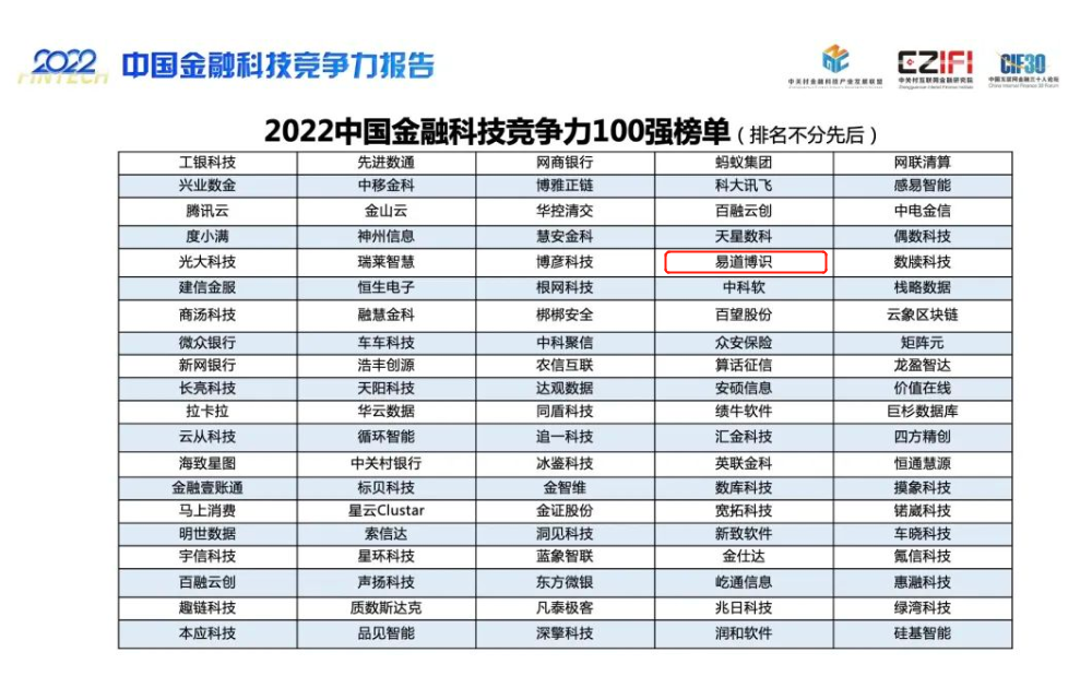 近日,由中關村金融科技產(chǎn)業(yè)發(fā)展聯(lián)盟、中關村互聯(lián)網(wǎng)金融研究院和中國互聯(lián)網(wǎng)金融三十人論壇主辦的“2022第六屆金融科技與金融安全峰會”在京成功召開。會上,《2021中關村金融科技30強榜單》和《2022中國金融科技競爭力100強榜單》雙雙出爐,易道博識實力入選雙榜!
