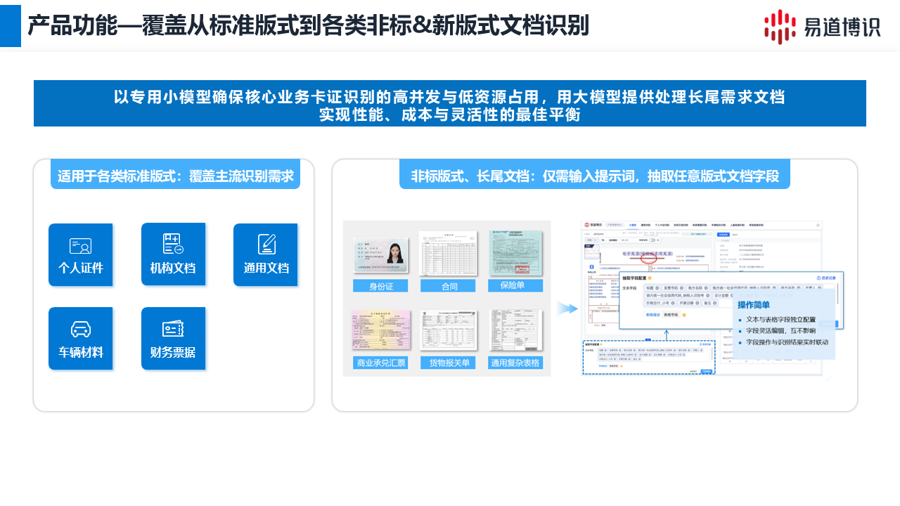答:盡管大模型泛化能力強,但在處理身份證等高頻標(biāo)準(zhǔn)文檔時,存在成本高昂、速度慢、字符級識別率偏低等問題。在這些場景下,專用小模型具備成本低、速度快、識別精度高的優(yōu)勢,是更經(jīng)濟高效的選擇。
